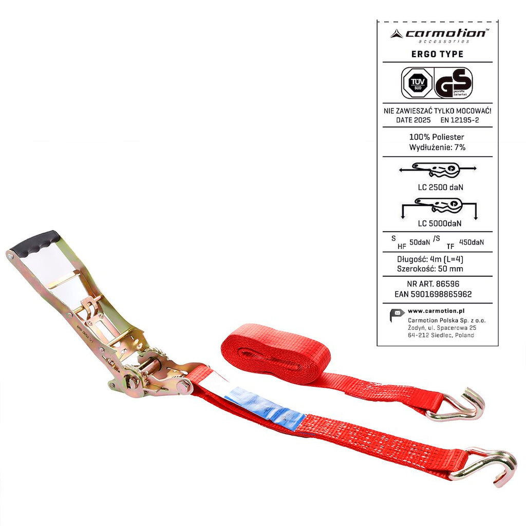 Az ERGO ERGO racsnis rögzítőheveder, 50 mm szélességgel és 4 m hosszúsággal ideális megoldás lehet, ha megbízható rögzítési lehetőséget keres. Az erős, 5000 kg-os maximális terhelhetőség garantálja, hogy nagyobb súlyok biztonságosan rögzíthetők, így a szállítás során nem kell aggódnia a terhek elmozdulása miatt.