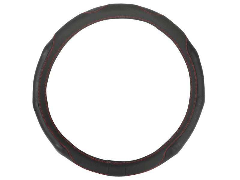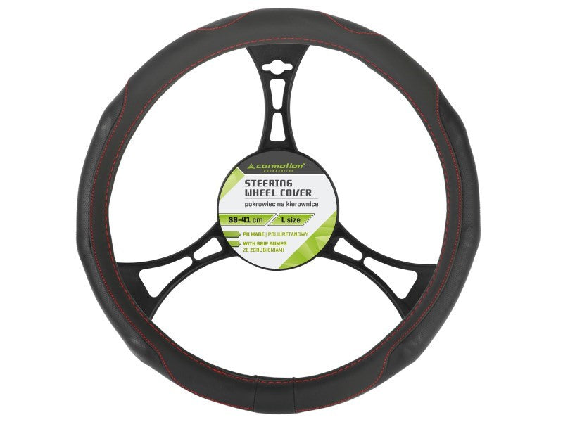 A Kormányvédő PU 39-41 cm "L", perforált markolatok, fekete + piros szálakkal ideális választás, ha tartós és esztétikus kiegészítőt keres járművéhez. Kiváló minősége és egyszerű használata miatt hosszú távon is kényelmes megoldást nyújt a vezetés során.