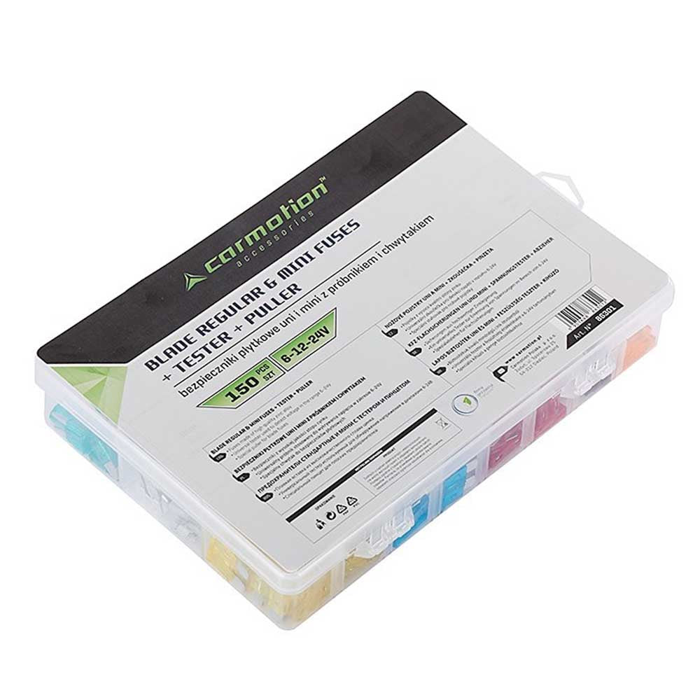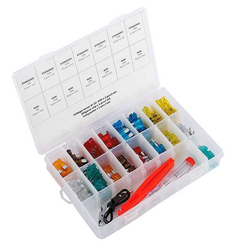 150 darabos mini és standard késes biztosítékkészlet kiváló minőségű cinkötvözetből, 6-24 V-os feszültségvizsgálóval és biztosítéktartóval.