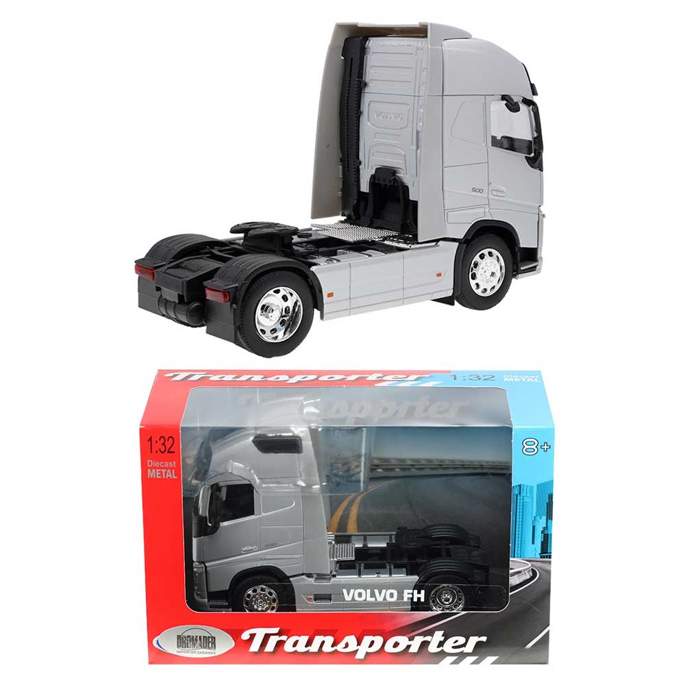 A Volvo FH 1:32 méretarányú nyergesvontató modell a modern kamionok letisztult, professzionális világát jeleníti meg részletgazdag, fém kivitelben. Ezüst színe és arányos kialakítása elegáns, erőt sugárzó megjelenést ad a modellnek.
